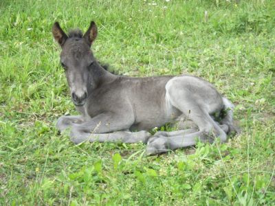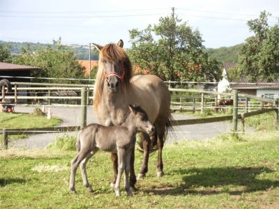 Bjarki vom Ungerhof heißt der kleine Hengst, der am 11. Juli 2007 zur Welt kam. Immerhin ist er 3 Wochen zu früh geboren worden. Dies merkt man ihm allerdings nicht an. Er tobt schon mit Fengur und Stormur auf der Koppel und im Stall herum. .jpg) Da er ein sehr ausgeschlafener kleiner Kerl ist, hat seine Mutter Svala viel Mühe, ihn unter Kontrolle zu haben. Es ist ihr erstes Fohlen und sie ist sehr besorgt. Bjarki wird wie sein Vater Sunna-Dagur einmal Rappe werden. Wie er sonst noch wird werden wir in den nächsten Jahren erfahren. Auf jeden Fall kann er schon flehmen, prusten, wiehern und hinten ausbocken wie ein Großer. .jpg) |