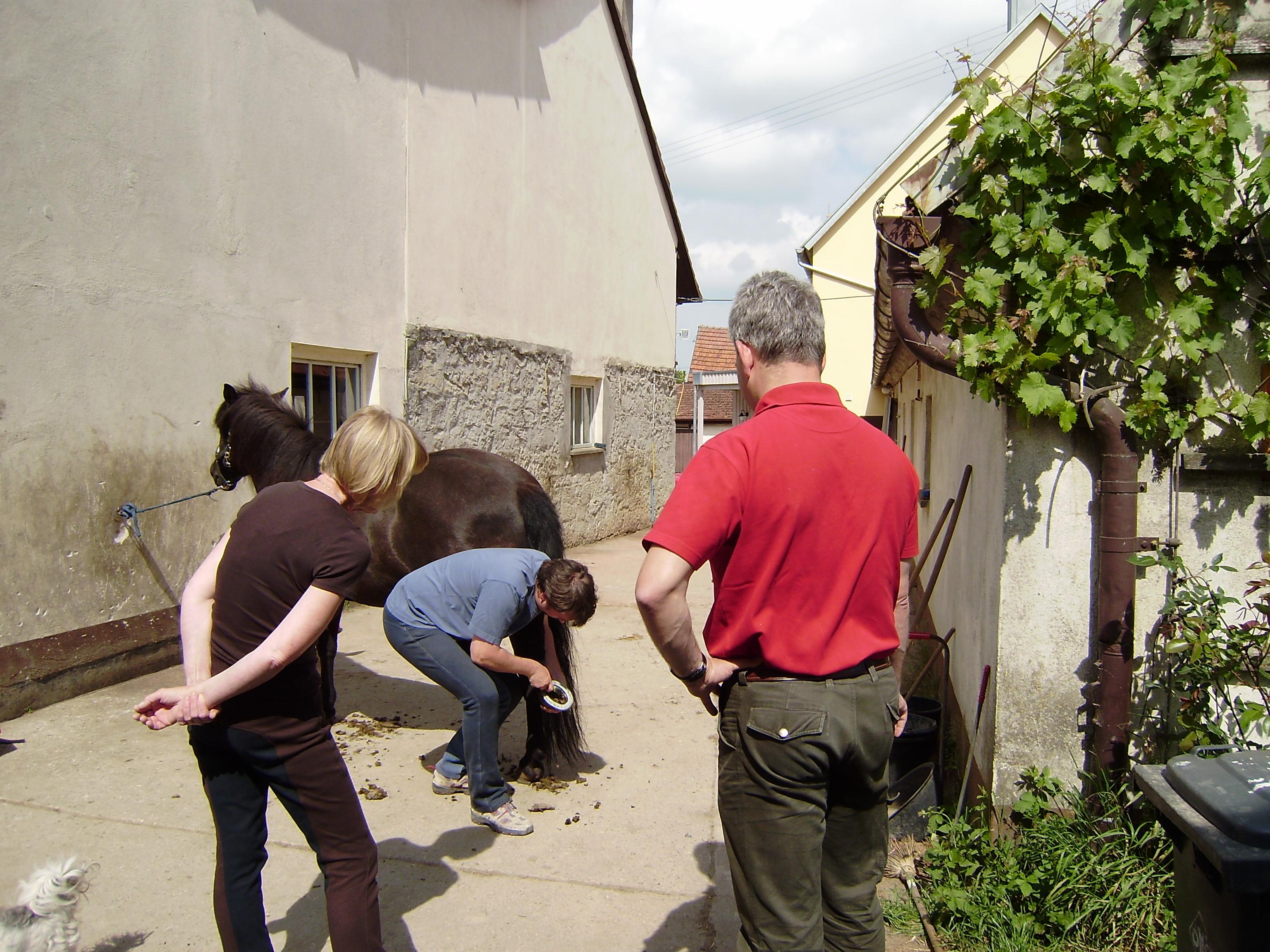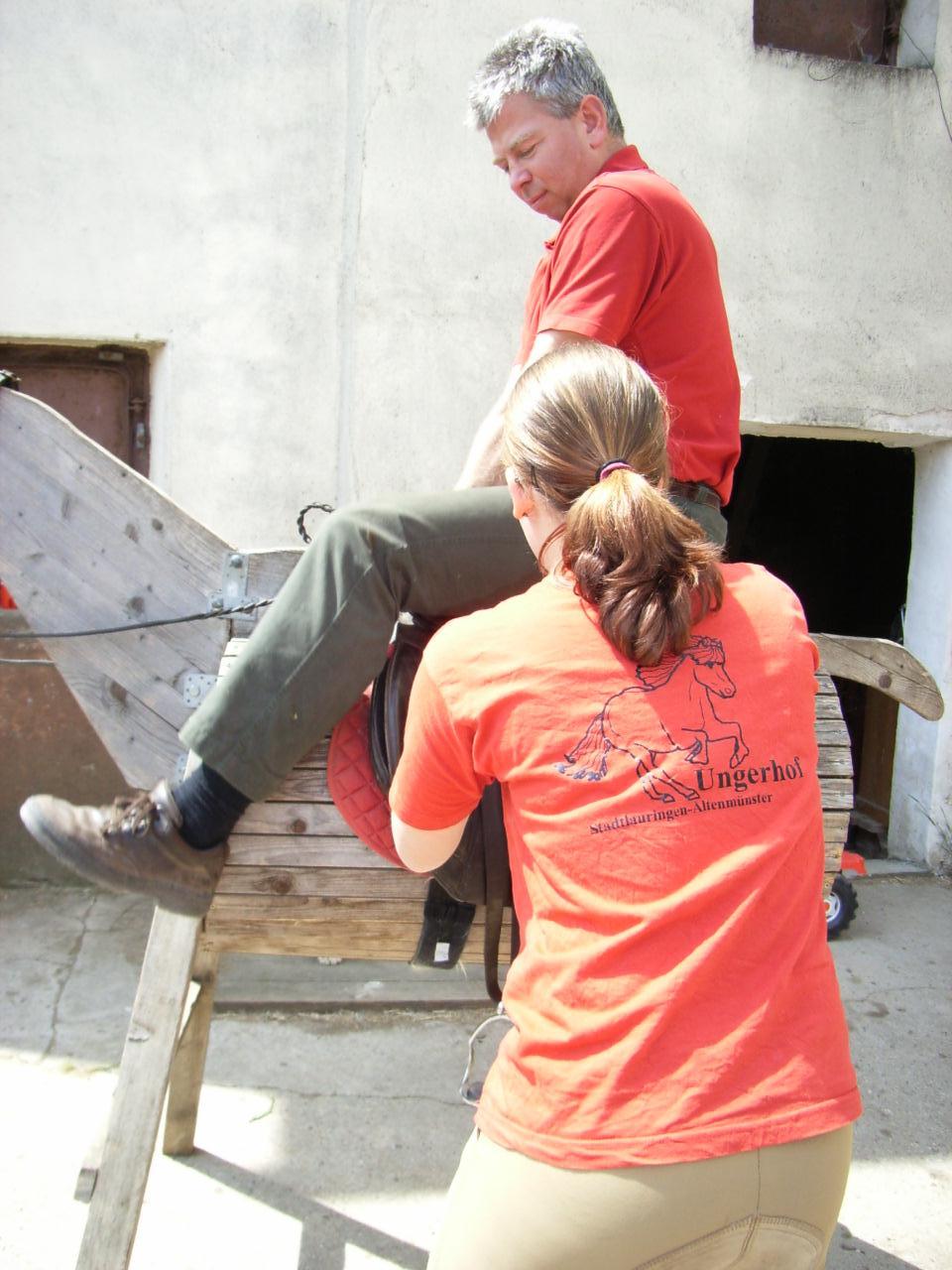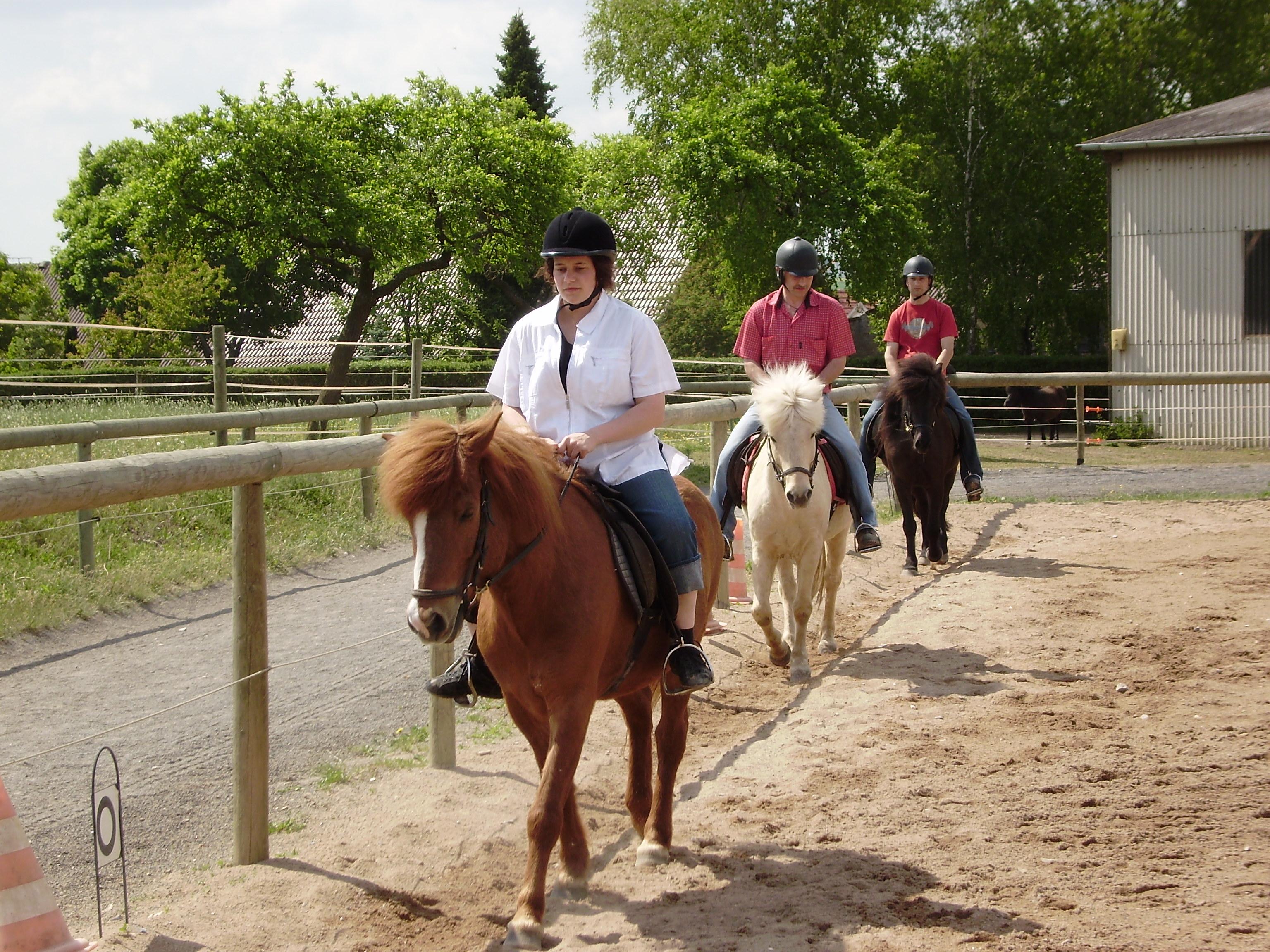 Er war nicht nur vom Wetter her bombastisch....sondern auch von den Teilnehmern. Wir konnten unsere gesteckten Ziele problemlos erreichen, da alle so motiviert waren.  Am Anfang steht immer die graue Theorie, die man sich allerdings mit Kaffee und Kuchen versüßen kann. .jpg) Wohin mit dem ganzen Leder?  Vorbereitung zur ersten Reitstunde .jpg) Longe ist zu Beginn unerlässlich  Vorbereitung zur ersten Reitstunde  Während die erste Gruppe reitet, trainiert die zweite fleissig am Holzpferd weiter .jpg) |